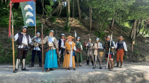 | Sous notre bannière, « partie de sinople et d'azur parée de trois cochons d'argent », nous invitons le public à découvrir la vie quotidienne de cette époque. |