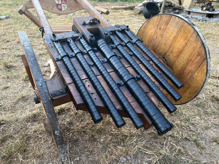 Un ribaudequin, canon à plusieurs fûts. Six fûts de coulevrines se chargeant par la gueule et un fût principal plus large, de veuglaire, se chargeant avec une chopine (culasse) à l'arrière. Baptisée : L'Isabeau, en mémoire d'Elisabeth de Bavière, femme de Charles VI. |